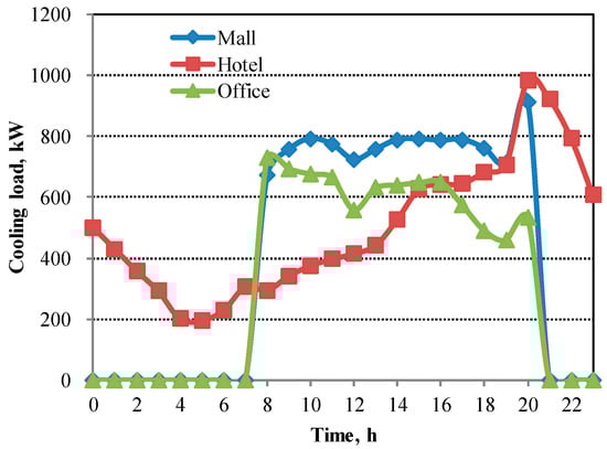 Two additional buildings in Beijing, namely a shopping mall and an office building, are selected for comparison with the hotel building and for analyzing the application of the solar cooling system in different buildings. The hourly cooling loads are shown in Figure 11, and the simulation results are listed in Table 6.