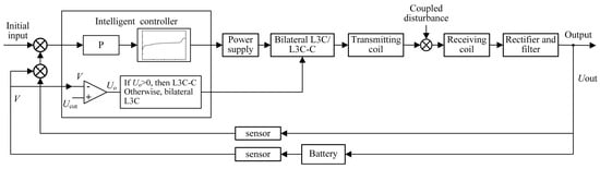 The block diagram of the EV wireless charging control system is shown in Figure 2. It consists mainly of a controllable power supply with a high-power and high-frequency, an intelligent controller, a compensation network, an electromagnetic coupler, a battery, and data communication. The initial input to the system is the initial voltage of the power supply. The output is the battery charging voltage, and the feedbacks are the battery voltage and the charging voltage. After comparing the charging voltage and the battery voltage, the intelligent controller performs arithmetic processing and issues a command to the power source (the control target and the actuator of the control system) to control its output voltage. The battery acts as both a voltage output object and a device to feed back the voltage. Coupling interference includes disturbances such as foreign matter between couplers and positional offset.