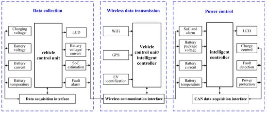 The EV wireless communication unit is shown in Figure 3. The unit realizes information interaction in the charging system, which is divided into three modules, namely, data acquisition, wireless data transmission, and power control. The last module is the key to the control system that realizes the adaptive smart charging control.