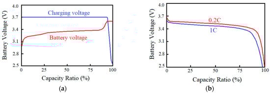 The measured battery charge and discharge characteristics: (a) charge characteristics and (b) discharge characteristics.
