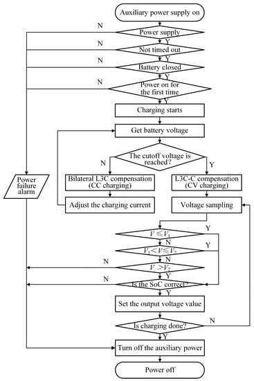 - The system shutdown phase. System shutdown is divided into normal and abnormal shutdown. If the battery is charged full and the voltage, current, SoC, and temperature are normal (i.e., no alarm information appears), the control system sends the normal shutdown command, the auxiliary power turns off and charging system powers off. Abnormal shutdown includes that voltage, current, or temperature is out of the normal range. Then the system sends the battery alarm information: an overvoltage alarm is generated when the single voltage exceeds 3.75 V and an undervoltage alarm is generated when the voltage is lower than 2.5 V; the upper limit of the temperature alarm is 60 °C and the lower limit is −10 °C Abnormal system shutdown also includes that the SoC estimation is wrong. After the judgement, the power is cut off immediately to protect the charging system.