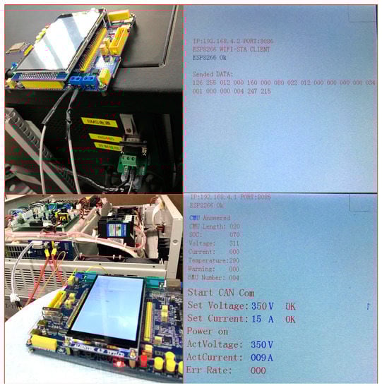 In this section, the data collection experiment and the wireless data transmission experiment are described. First, the vehicle terminal was connected to the corresponding communication interface of the battery through the serial port, and the serial communication program was prepared according to the BMS data protocol, so that the battery state parameters could be collected. Then, the vehicle terminal transmitted the battery information to the intelligent controller through the WiFi wireless communication, and the intelligent controller parsed the received battery information according to the communication protocol and sent a control command to the power supply for charging control. The experimental platform of wireless data transmission is shown in Figure 8, where the vehicle terminal uses STM32F103 (STMicroelectronics, Geneva, Switzerland) and the intelligent controller uses STM32F407 (STMicroelectronics, Geneva, Switzerland).