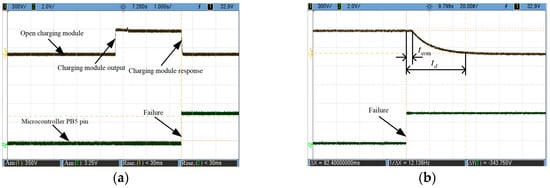 In order to ensure the reliability and real-time performance of the wireless charging smart control system, the response time of the system was tested. A voltage probe of oscilloscope was connected to the battery terminal fault test pin, and another voltage probe was connected to the power output terminal. The battery BMS was powered on, the two MCUs were powered on, and the power was turned on. The authors then pressed the battery terminal MCU button to simulate the fault, which sent the command and powered off the protection, and the oscilloscope recorded the response time. The test results are shown in Figure 9. The time interval from the occurrence of the simulated fault to the power-off was 82.4 ms, and the real-time performance was high.