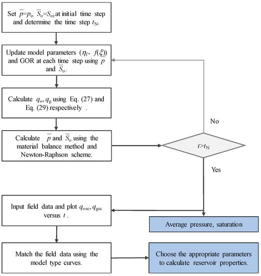 To calculate the average saturation and pressure in Equation (29), the nonlinear equations must be solved iteratively for the oil and gas phases respectively. In the following, a coupled flowing material balance technique is developed to forecast oil and gas production.