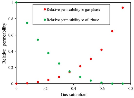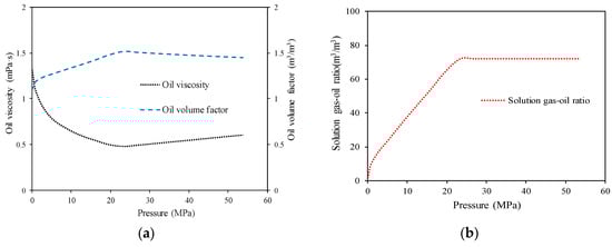 The proposed semi-analytical method is benchmarked against the commercial simulator Eclipse. A numerical model is built to simulate the two-phase flow of the horizontal volatile oil well. The input parameters for the semi-analytical and numerical model are identical, in which, the horizontal well has a wellbore length of 500 m and is located in the center of the formation. The reservoir diameter and thickness are 880 m and 38 m respectively. The initial reservoir pressure is 24.48 MPa and the bottom-hole pressure is fixed at 6 MPa during the production periods. The basic reservoir, horizontal well, and fluid properties are listed in Table 1. The initial pressure of the formation is higher than the bubble point of fluids, so the primary phase in the reservoir is the oil phase. In this case, the oil is assumed to be live oil, and the gas is assumed to be dead gas. The fluid properties and relative permeability curves used as input for the semi-analytical and numerical model are shown in Figure 3 and Figure 4 respectively.