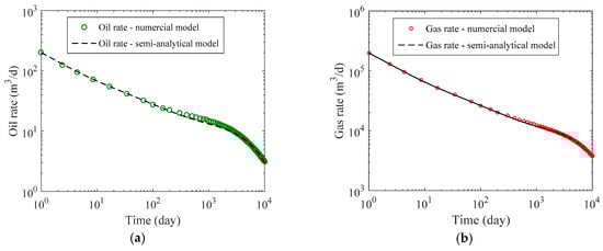 Results comparison of production rate between numerical simulation and the semi-analytical method for validation case: (a) log-log plot of oil production rate; (b) log-log plot of gas production rate.