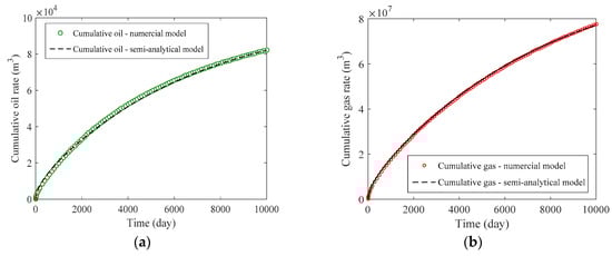 Results comparison of cumulative production between numerical simulation and the semi-analytical method for validation case: (a) Cartesian plot of cumulative oil production; (b) Cartesian plot of cumulative gas production.