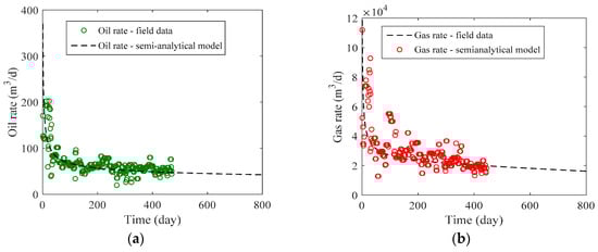 This section provides a flow chart for two-phase history matching and production forecasting with the proposed semi-analytical method. The procedure for estimation of oil and gas production rate and history matching is shown in Figure 2. To conduct history matching and production prediction with the new method successfully, the reliability of model inputs such as reservoir parameters, relative permeability curves, fluid properties, and field data are very significant and should be checked carefully before being used in the model. The production is calculated with the semi-analytical model step by step, and the time increment is given by one day in accordance with the production data. Firstly, the initial average pressure and average saturation are used to calculate the production of the oil phase with Equation (27). The output of the gas phase is forecast with the producing GOR (Equation (29)). The average pressure and saturation within the investigated area are calculated with the flowing material balance equation. Calculations are then repeated for this time step using the Newton–Raphson scheme (Equation (46)). Thus, nonlinear parameters and GOR are updated with the average pressure and saturation at each time step. After that, the production rate curves of oil and gas phases using the proposed model are employed to match the field data. In this paper, we adopted the nonlinear least-square curve fitting method to conduct field data matching by using the semi-analytical method.