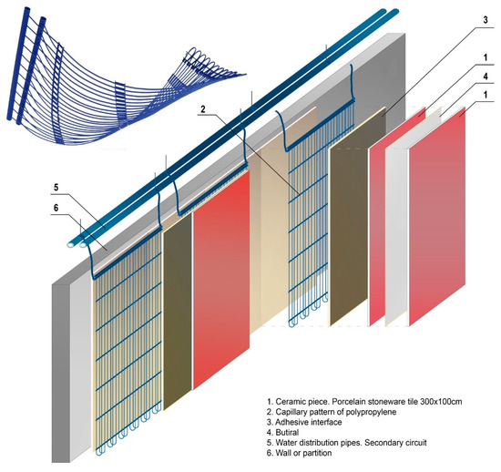 The “Technology and Sustainability in Architecture” research group at the University of Alicante (Spain), recently obtained a patent for a thermal ceramic panel (TCP) [32] based on large porcelain stoneware tiles that incorporate capillary tube mats made of polypropylene tubes using conductive paste adhesive (Beka, V.WLP.1 Thermal Conductive Paste) (Figure 1). The maximum format is 320 cm × 160 cm and 16 mm thick, with two large format ceramic tiles 3 mm thick, with a maximum weight of 22 kg/m2, although the tiles can come in a single 3 mm or 9 mm thick piece weighing 12 kg/m2 and 25 kg/m2, respectively. This lightweight panel can be easily placed on walls and ceilings using a metal rail fixation system [33].
