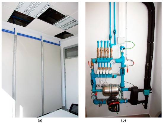 A thermal ceramic panel (TCP) in an office at Alicante University. (a) Distribution management substation. TCP panels in the standard office of the Multipurpose III building. University of Alicante; (b) Substation for management and control of distribution circuits.