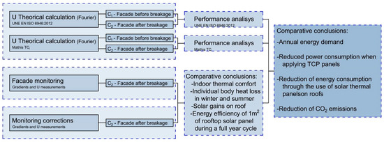 This study aims at quantifying the annual energy demand reductions in multi-storey residential buildings on the Spanish Levante coast thanks to the use of thermal TCP panels, comparing it to that of conventional convective systems such as VRV and all-air installations. To perform the study, we installed a water distribution system based on the TCP panel capillary mat system (Figure 2). A domotic system for controlling the panel surface temperature parameters, indoor air temperature, and 50% of relative humidity was included. In addition, the extent of use of renewable energies in the TCP panel system was evaluated by incorporating thermal solar panels located on the common building roof into the system. To finish, we quantified the energy consumption of both systems for each component [37]: pumps, circulators, heat pumps, split ventilators, solar energy input from common roof panels, etc. Comparative tables were drawn up to show the energy saving results of TCP panel systems, especially when solar thermal panels were used in climatic areas with long periods of sunlight, both in summer and winter. Figure 3 shows the study’s methodology flow diagram.