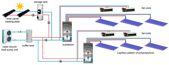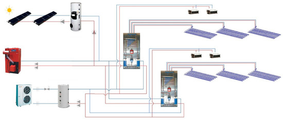 Figure 5 shows the circuit diagram with the contributions of solar energy as a support system. The water in the solar thermal panels primary circuit heats the tank water up to 60–80 °C. Depending on the tank’s size, it is possible to obtain greater inertia in the system to solve nighttime demand. From this point, a primary circuit is distributed to the substation exchangers, and different PPR capillary tube circuits are distributed from there. In segments with sufficient thermal gaps, the energy consumption would simply total that of the two water circulators.
