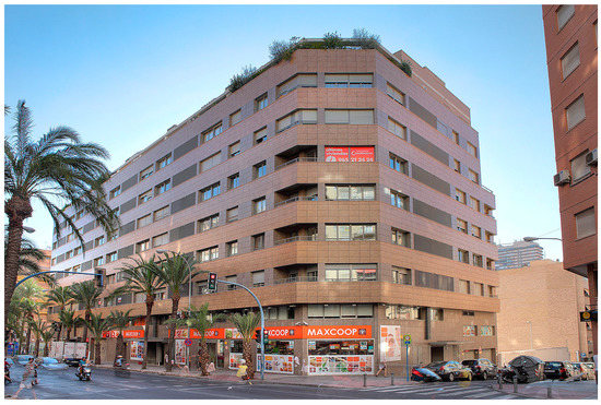 The building under study was located in the urban area of Alicante city (Figure 3). This corner building has a façade giving onto Benito Pérez Galdós Avenue and another giving onto Catedrático Ferre Vidiella Street. The building houses 69 flats with 2, 3, or 4 bedrooms; garages; and storage rooms. It has 9 different types of homes (flats A–F, penthouse types N–P). It has a corner building between the party walls, with a ground floor, 6 more floors, and a loft. There are 5 vertical communication nuclei.