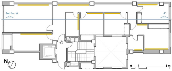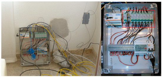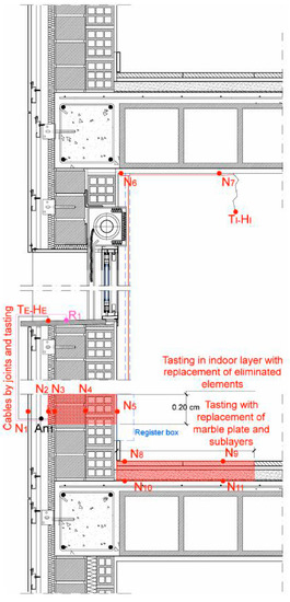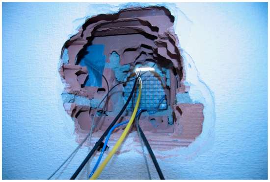Time ago, the sensors were introduced after the completion of the building. The sensors were introduced to the surfaces according to the location layout shown in Figure 10. The damage to the enclosure was repaired once the sensors were placed with connecting cables to the analyser (Figure 11 and Figure 12). The various layers of plaster, hollow brick, perforated brick, polyurethane, etc., were sealed back to ensure maximum continuity with the original materials. (Figure 12).