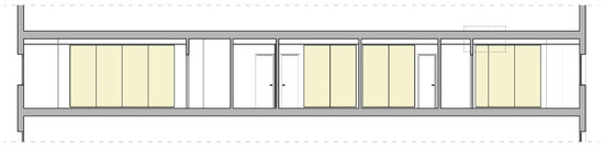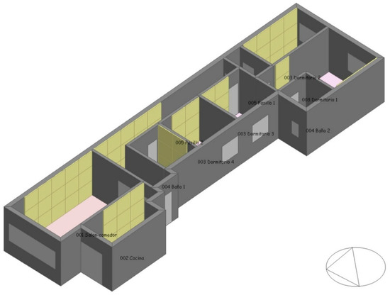 The home under study was one of the building’s type C flats (Figure 7). It consisted of 2 bathrooms, 4 bedrooms (2 bedrooms giving onto the interior patio of the building measuring 4 × 4 m2 and 2 bedrooms giving onto the block’s interior courtyard), a living room, and kitchen oriented towards the façade giving onto Benito Pérez Galdós Avenue (Figure 8 and Figure 9). None of the flat’s boundaries corresponded to the party wall.
