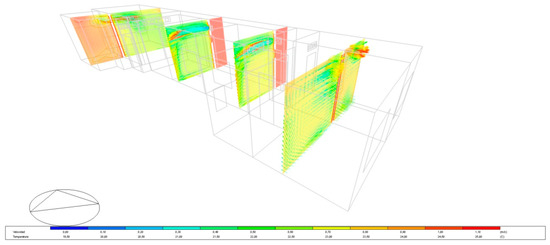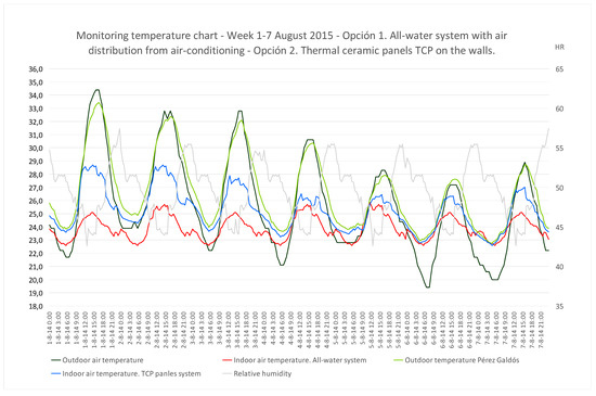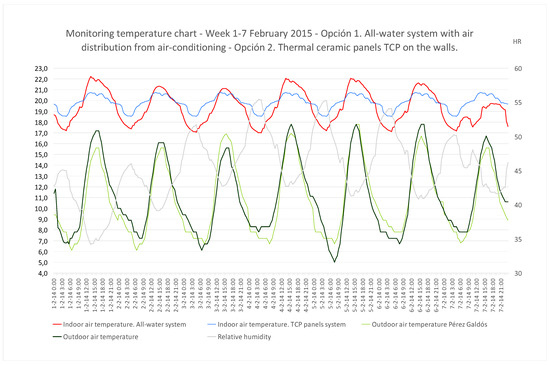 A dwelling included in a block of flats located near the Alicante city coast, on Benito Pérez Galdós Street, was monitored during the complete 2015 cycle. Surface temperature sensors (PT 100) were fixed on all the interior layers of the enclosure. The system used to pierce the layers produced a perforation of approximately 0.40 m in diameter in the lower right section. The sensors were thus introduced into all 5 layers that made up the wall. Subsequently, these layers were sealed back with similar materials to the original ones. The sensors enabled the drawing of a graph of thermal gradient curves throughout the year, as well as variations in the dynamic regime [35]. Wall surface temperatures, solar radiation, relative humidity, etc., could also be graphed. Simulations of the building’s thermal and energy behaviour were carried out using the Design Builder tool. To calibrate the model, the house’s monitoring results were used [35]. An office using TCP panels at the University of Alicante was also monitored, its performance was checked, and the parameters obtained from the surface temperature, the temperature and relative humidity of indoor air, the indoor air velocity, and convection currents were applied. The results obtained in previous studies on a single-family home next to the building, which also had TCP panels and had been monitored, were equally retrieved [30]. The home’s electrical energy consumption in its current state, measured with a conventional meter, also contributed to the model’s calibration process. It was possible to make a comparative analysis with the single-family flat, but not with other building blocks, as this was the first time these TCP panels were implemented in these types of buildings. The implementation of capillary tube systems in housing blocks in the Spanish Mediterranean have not been researched either, until now [36].