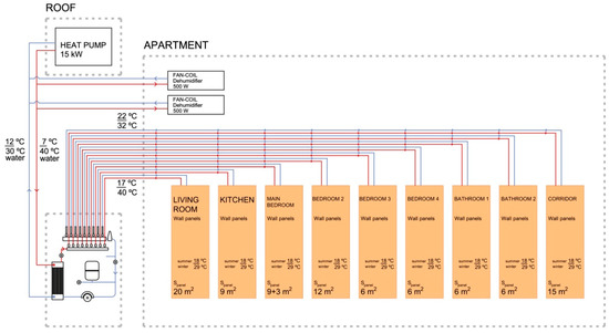 Previous studies and publications have found that radiant systems lead to energy consumption reductions of between 20% and 30% compared to all-air systems [14,16]. In some cases, energy consumption savings can reach 40% when applying capillary tube solutions, compared to variable air volume systems [38]. However, research on residential use is still scarce, particularly in coastal climates, where energy consumption due to dehumidification can be high.