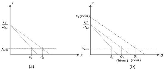 Equation (4) indicates that the active power is proportionally shared by . Consequently, the active power sharing among DGs is totally determined by coefficients no matter how the system loads vary. Usually, the droop coefficients of DGs are chosen to be proportional to each DG’s power generation capacity. As a decentralized mechanism to effectively enforce active power sharing [24], unfortunately, the droop control is limitedly effective for the reactive power.