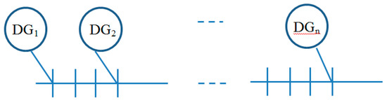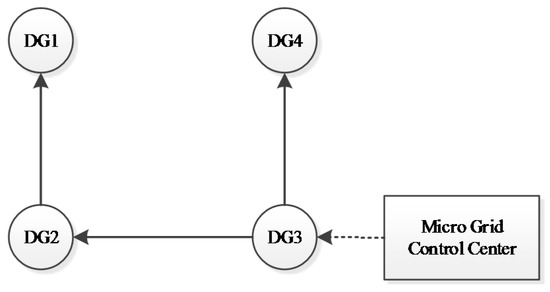 There are abundant MG control solutions proposed without communication among DGs when all DGs are connected to a single bus. According to Equation (6), for instance, the reactive power sharing issue could be resolved by properly adjusting droop coefficients Dq,i. To make the transmission line impedance predominantly inductive and uniform when transmission lines are assumed to be non-inductive or transmission line parameters are uniform or even unknown, especially, the virtual impedance loop technique can be adopted to adjust the virtual transmission line impedances [9,10,11]. In a meshed network, nevertheless, it can be shown that the communication among DGs connected to different buses is still required for accurate reactive power sharing.