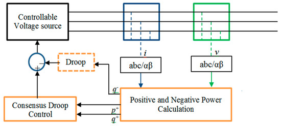 Considering that negative sequence voltage is normally caused by voltage imbalance, the voltage imbalance can be compensated by reducing the negative sequence voltage. To reduce negative sequence voltage, a sequence component analysis module is used in the droop control. The diagram of droop control with sequence component analysis is shown in Figure 5.