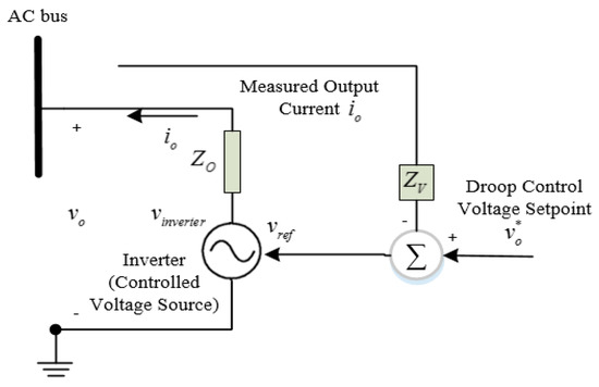 Virtual impedance loop is adopted to adjust the output impedance of DGs. It is implemented right after the droop control, as shown in Figure 6. For the inverter, when the droop control output is defined as , the reference voltage becomes , where is the output current measurement and is the virtual impedance.