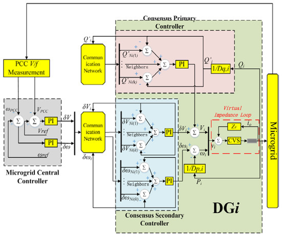 In this section, a consensus-based primary and secondary control framework is proposed to solve the voltage regulation and reactive power sharing problem. Based on the discussion in Section 3, communication between DGs is required. However, sparse communication infrastructure is sufficient for the proposed framework. The sequence component analysis and the virtual impedance are used to solve the system unbalance and high R/X ratio problems.