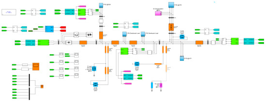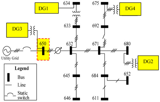 To validate the proposed control methodology, a microgrid testbed is set up, which is a modified version of the 4.16-kV IEEE standard 13-bus test feeder [25]. The testbed is shown in Figure 9. Bus 650 is selected as the critical bus, or the Point of Common Couple (PCC), whose voltage and frequency are to be regulated. The communication graph is shown in Figure 10. Simulations in this section are carried out in the Matlab/Simulink environment, using the Simscape Power System toolbox. The model built in Matlab is shown in Figure 10.