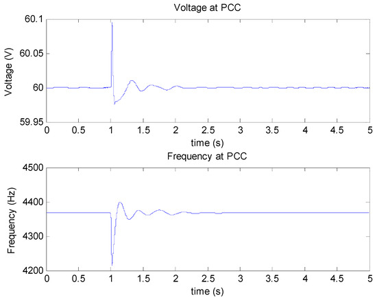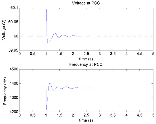 Simulation results of Scenario I are shown in Figure 11 and Figure 12. Simulation results of Scenario II are shown in Figure 13 and Figure 14. Measurement of power sharing for all DGs, voltage and frequency at PCC in steady state are compiled in Table 6 and Table 7 respectively. It is noted from the simulation results that: