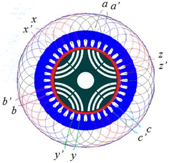 In order to demonstrate the two-step optimization processes of a motor, the six-phase synchronous reluctance motor with specifications of six-phase, 4-pole, 24-slot, 1800 r/min and 4 kW is investigated in this study. The abridged general view of the six-phase synchronous motor is shown in Figure 1. Table 1 is listed out the initial design parameters for the six-phase synchronous reluctance motor. The initial design of the motor consists of a stator with 24 stator slots which carry two-layer windings as shown in Figure 1 and Table 1. The six labels of six phases in the six-phase synchronous reluctance motor shown in Figure 1 are phase a, phase b, phase c, phase x, phase y and phase z with respect to six sets of stator windings with two outlet line ends as a, a’, b, b’, c, c’, x, x’, y, y’, z, z’. The better design of the six-phase synchronous reluctance motor is based on the good design procedures and calculations as follows.
