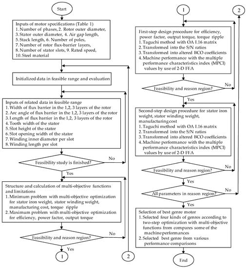 Total experimental results transformed into the S/N ratios and altered BCO coefficients based on altered BCO analysis are shown in Table 3 and Table 5. The S/N ratio is used to determine the deviation between the experimental value and the desired value. The summary performance results according to Table 3 and Table 5, Figure 2 and Figure 3 are presented in Table 6. The performance of the optimized motor was obtained by use of 2-D FEA again. To illustrate the process of the proposed optimuzation design, the flowchart diagram of two-step optimization design procedures with multi-objective functions is shown in Figure 4. The results of machine performance from two-step optimization design with respect to five control factors are presented in Table 6. Table 6 compares some of the machine performances from selected four kinds of genres according to two step optimization with multi-objective functions. Here, the machine performances such as iron weight, winding weight, manufacturing cost, power factor, efficiency, output torque and torque ripple are summarized in Table 6.