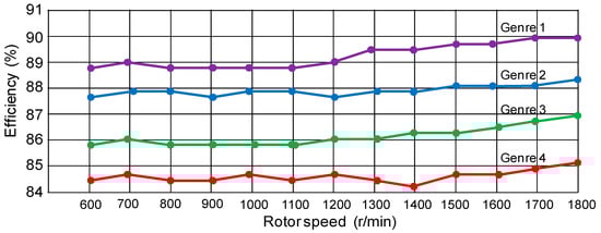 Line chart of comparisons of efficiency for 4 kinds of six-phase synchronous reluctance motors mounted to centrifugal compressor with various speeds.