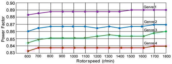 Line chart of comparisons of power factor for 4 kinds of six-phase synchronous reluctance motors mounted to centrifugal compressor with various speeds.