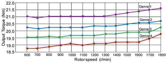 Line chart of comparisons of output torque for 4 kinds of six-phase synchronous reluctance motors mounted to centrifugal compressor with various speeds.