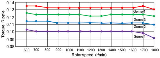 Line chart of comparisons of torque ripple for 4 kinds of six-phase synchronous reluctance motors mounted to centrifugal compressor with various speeds.
