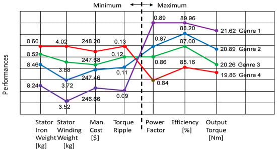 The line chart of seven kinds of performances in four kinds of configurations of six-phase synchronous reluctance motors listed in Table 6 is shown Figure 9. It is very obvious that many characteristic performances in the genre 1 of six-phase synchronous reluctance motor is superior to the genres 2, 3 and 4 through the optimal design with multi-objective functions by use of the altered BCO and the Taguchi method combined with FEA.