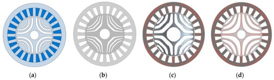 Full cross-section views in four genres of configurations of six-phase synchronous reluctance motor: (a) genre 1; (b) genre 2; (c) genre 3; (d) genre 4.