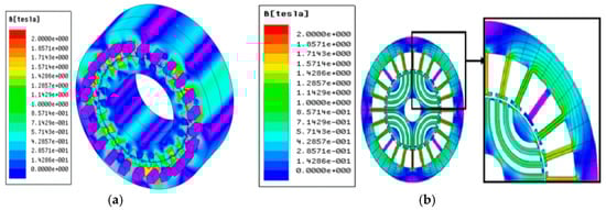 Magnetic flux with FEM analysis solutions after two-step optimization in genre 1 of six-phase synchronous reluctance motor: (a) full cross-section view of three-dimensional diagram at stator and windings; (b) full cross section and quarter cross section of two -dimensional diagram at stator and rotor.