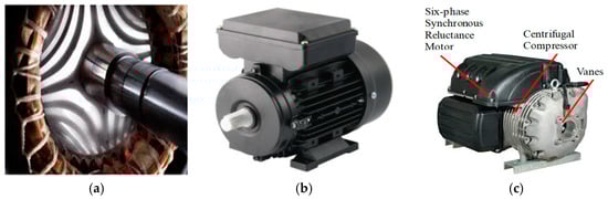 Completed photo pictures of six-phase synchronous reluctance motor: (a) stator, rotor and winding; (b) combination; (c) six-phase synchronous reluctance motor mounted to a centrifugal compressor.