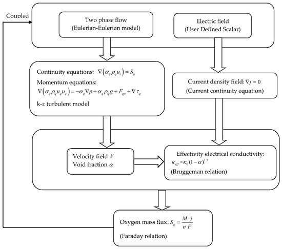 Since the oxygen-released mass flux Sg on the anode was coupled with the current density from Faraday’s Law, the electrical potential field (Equation (7)) and velocity field (Equations (8)–(23)) were coupled in the present study. The algorithm used to solve this coupling effect between the electric potential and velocity fields is shown in Figure 2. For the two-phase flow (the Eulerian–Eulerian model), the governing equations were solved numerically using the commercial software FLUENT 18.1 [], whilst for the electrical potential field, a user-defined transport equation written in C language was incorporated in FLUENT 18.1.