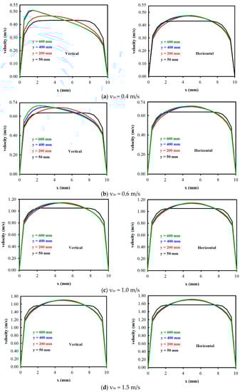 Figure 4 shows the velocity distributions under four different inlet electrolyte (acrylonitrile, AN) velocities with vin = 0.4, 0.6, 1.0, and 1.5 m/s, at four different streamwise locations y (y = 50, 200, 400, and 600 mm), for a vertical and a horizontal electrolysis cell, respectively. It should be noted that the vertical Archimedes force on the bubble was only affected for the vertical electrolysis cell, but not for the horizontal cell. In addition, it was expected that the Archimedes force effect on the velocity distribution would be significant for a low inlet electrolyte velocity. This can be seen from Figure 4a–d for a vertical cell. When the inlet electrolyte velocity was 0.4 m/s, at y = 50 mm, the maximum velocity occurred at the cell center (x = 5 mm), while at y > 200 mm, the velocity near the anode was increased due to the Archimedes force on the oxygen bubble near the anode. It was observed that, for y = 600 mm, the maximum velocity no longer occurred at the center but rather occurred near the gas evolving electrode, and it was as high as 0.51 m/s. When the inlet electrolyte velocity reached 1.0 m/s and 1.5 m/s, this phenomenon almost disappeared, and the maximum velocities occurred at the cell center. On the contrary, this phenomenon hardly existed for the horizontal electrolysis cell. The velocity distributions for vin = 0.4, 0.6, 1.0, and 1.5 m/s were almost consistent with different inlet electrolyte velocities, and the maximum velocities were at the center, for which their corresponding numerical values were 0.466 m/s, 0.69 m/s, 1.138 m/s, and 1.69 m/s, respectively.