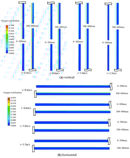 Figure 5a,b show the void fraction contour under four different inlet electrolyte velocities, with vin = 0.4, 0.6, 1.0, and 1.5 m/s, for a vertical cell and a horizontal electrolysis cell, respectively. As expected, for a given velocity, the oxygen void fraction increased along with the streamwise direction (y). This was due to the accumulation of oxygen gas along with the electrode, and thus the total release of mass flow rate for oxygen was increased along with y. It was also seen that, for a given velocity, the void fraction for a horizontal cell was higher than for a vertical cell. In addition, as the velocity was increased, the void fraction decreased. The quantitative comparison is explained in the following paragraph.