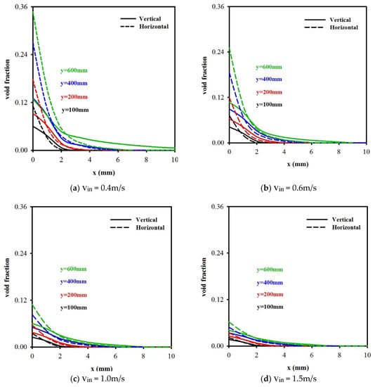 The void fraction distribution vs. x for different vin and y for a vertical cell and a horizontal cell.