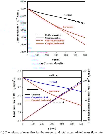 Figure 7a,b show the current density (j), the oxygen-released mass flux (Sg), and the total accumulated mass flow rate (), respectively, along the streamwise direction (y) of the electrode for a vertical cell and a horizontal cell with vin = 0.4 m/s. One can see that the increase in gas accumulation () resulted in a gradual decrease in current density (j), as well as a decrease in the oxygen-released mass flux (Sg) along the streamwise direction of the electrode. For example, for a vertical cell, when the electrode length was 300 mm and 600 mm, the corresponding current density jvertical, y=300mm = 0.3889 A/cm2 (decreased by 2.8%) and jvertical, y=600mm = 0.3796 A/cm2 (decreased by 5.1%), respectively, compared to that at the inlet (y = 0, j = 0.4 A/cm2), whilst for a horizontal cell, the decrease in the current density was higher, jhorizontal, y=300mm = 0.376 A/cm2 (decreased by 6.0%), and jhorizontal, y=600mm = 0.3596 A/cm2 (decreased by 10.1%), respectively. Additionally, showing for the comparison are the results (indicated in broken lines) for the case of uniform oxygen-released mass flux Sg, where Sg was calculated from Equation (8) by assuming the average current density j = 0.4 A/cm2. A close look at the figures indicates that the uniform oxygen-released mass flux Sg assumption for y = 600 mm overestimated the total gas accumulation mass flow rate () by 2.8% and 5.8% for a vertical cell and a horizontal cell, respectively, and underestimated the current density by 0.3% and 2.4% for a vertical cell and a horizontal cell, respectively.