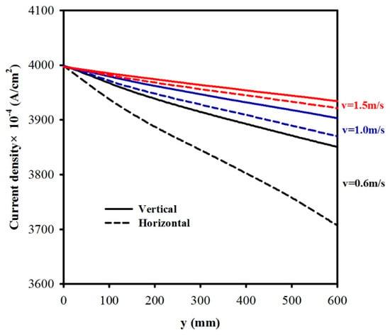 A comparison of current density distribution along the electrode y for a vertical cell and a horizontal cell, with three different vin = 0.6, 1.0, and 1.5 m/s.