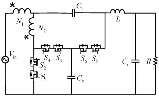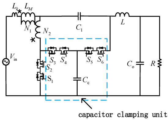 The designed novel reversal Γ-shape coupled inductor high-step converter based on the Γ-source impedance network. The Γ-source converter in this paper is showing in Figure 1 below. As we can see from Figure 1, the proposed converter consists of a coupled inductor (LM), inductor (L), switches (S1, S2, S3, S4, S5 and S6), capacitors (C1, Cc and Co) and load (R). The numbers of turns of the two windings of this coupled inductor are N1 and N2. The unique characteristic of this converter is that the closer the turns ratio (N = N1:N2) of the two windings (N1 and N2) is to 1, the more the boosting capability of this converter is enhanced. Therefore, this converter still has better boosting capability at a lower design cost and high engineering application value. To improve the voltage gain and decrease the voltage stress on switches, a capacitor clamping unit has been used in the proposed converter.