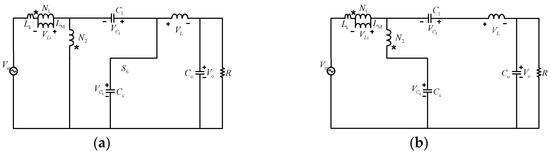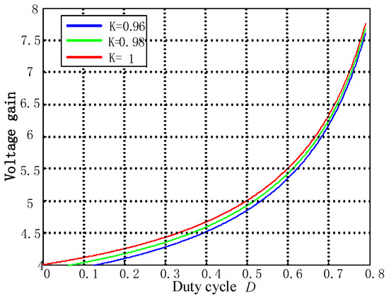 It can be obtained from Equation (4) that as the coupling coefficient K increases, the voltage gain of the proposed converter increases. If the coupling coefficient K is infinitely close to 1, the equation can be written as follows: