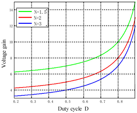 Figure 5 reflects the effect of the turn ratio N on the proposed converter gain. It can be derived from Equations (4) and (5) that the voltage gain would increase while the turns ratio is close to 1. This converter reduces the manufacturing cost while increasing the voltage gain. It also can simplify the structural design.