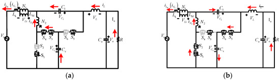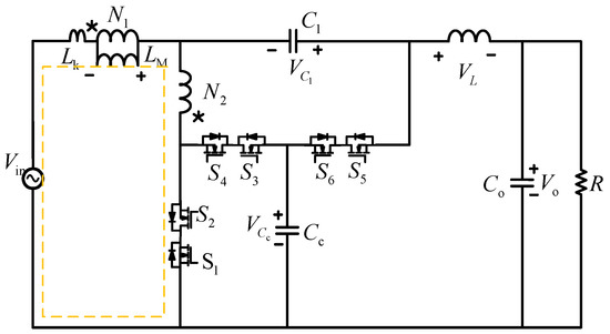 In shoot-through state, as shown in Figure 6b, switches S1 and S5 are turned ON. The voltage source Vin charges the input inductor LM, thus the magnitude of the LM current would increase gradually. The secondary inductor N2 and capacitor Cc are connected in series to charge the capacitor C1. During this mode the energy of the load R is supplied by the output capacitor Co and inductor L.