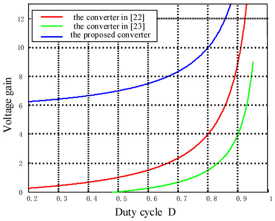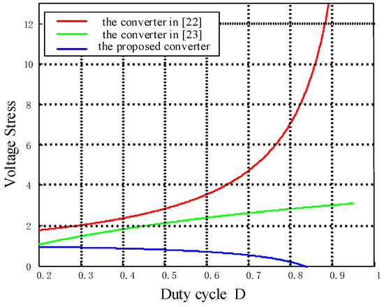 When the coupled inductor turns ratio is 1.5, the graphs of Figure 10 and Figure 11 are obtained. Figure 10 and Figure 11 show the output voltage gains and voltage stress of MOSFETs. Figure 10 and Figure 11 show that the voltage gain of proposed reversal Γ-shape coupled inductor converter is higher than that of previous topologies in [22,23] while the voltage stresses are lower. Figure 10 shows that the proposed reversal Γ-shape coupled inductor converter has a higher voltage gain than the converters in [22,23] under the same circumstances. Figure 11 shows that the proposed reversal Γ-shape coupled inductor converter has lower voltage stress than the converters in [22,23] under the same circumstances.