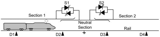The solution is based on two static switches, S1 and S2, connected to the neutral section, and each one to a different section; the topology is shown in Figure 2. Four position detectors, D1 to D4, are necessary to identify the position and direction of the train running on the NS.